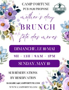 Brunch is being served in Pub 1920 from 9 a.m. to 1 p.m., by reservation only. Please email bamarica@campfortune.com or call 819-827-1717 X2208 for info or reservations.